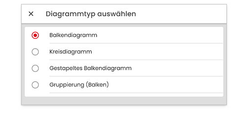 In contrast to the analysis widgets on the dashboard, you now have four different chart types to choose from. Already known are the bar chart and the pie chart. In addition, a stacked and a grouped bar chart are available here. More detailed information about the different chart types can be found in the article: