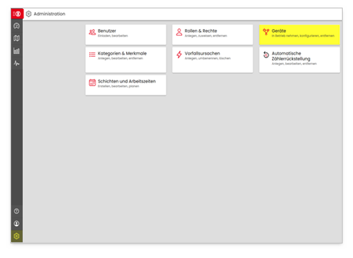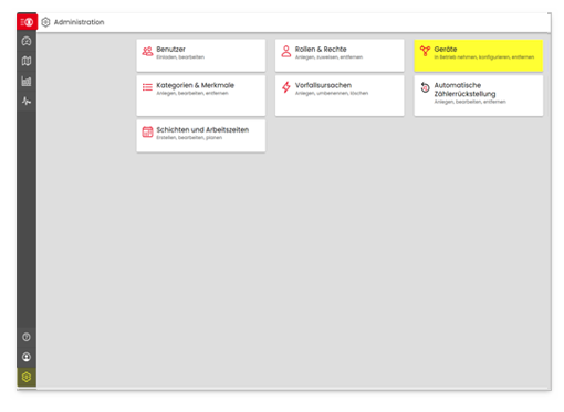Den Transceiver in WeASSIST hinzu-fügen, indem der Administrations-bereich ausgewählt wird. Im Anschluss wird der Bereich Geräte ausgewählt.