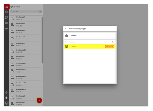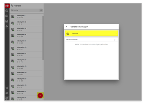 Im nächsten Schritt wählen Sie das Pluszeichen , sobald der WeASSIST-Transceiver in Funkreichweite zum Gateway ist, wird dieser automatisch unter Neue Transceiver an-gezeigt. Der WeASSIST-Transceiver wird mit dessen WEA MAC (z.B. 13-11-E1) in der Liste aufgeführt.