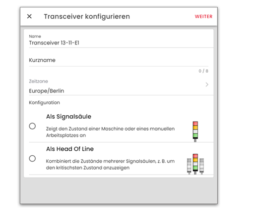 SCHRITT 2: Der Transceiver kann als Signalsäule oder Head of Line konfiguriert werden:
