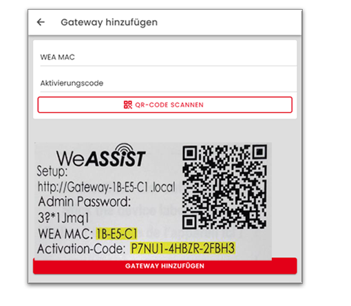 Geben Sie die WEA-MAC des Gate-ways und den Activation-Code ein, der auf dem an der Rückseite des Gateways angebrachten Etiketts angegeben ist.