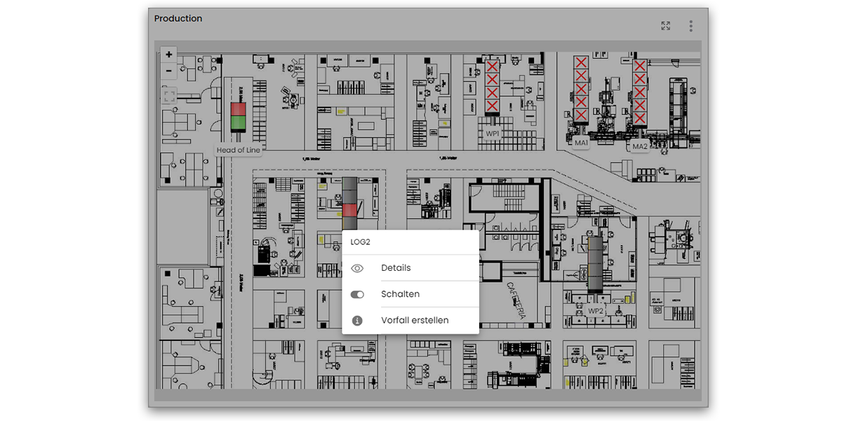 Status von Maschinen und/oder Arbeitsplätzen auf einen Blick im digitalen Zwilling Ihrer Produktion erkennen. Dafür nutzen Sie das Hallenplan-Widget mit Ihrem vorkonfigurierten Hallenplan.