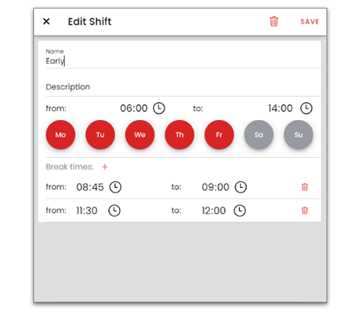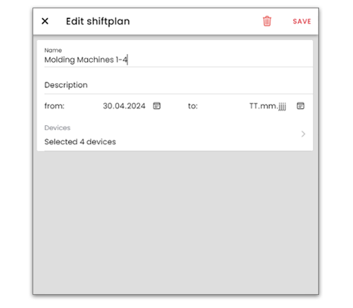 Mit der Verfügbarkeitskennzahl ermitteln Sie das Verhältnis von geplanter produktiver Zeit und wirklich geleisteter produktiver Zeit. Um die Kennzahl zu ermitteln, muss zuerst eine Planbelegungszeit definiert werden. Dies wird über eine Schichtplanung realisiert. Die Schichten und Arbeitszeiten finden Sie auf der Administrationsseite. Um Schichten zu definiere, gehen Sie wie folgt vor: