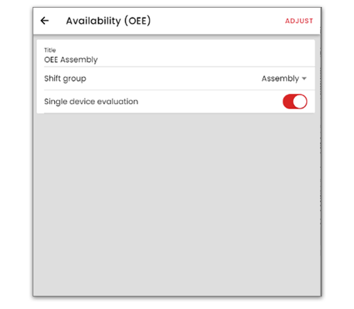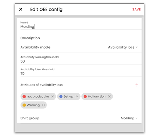 Nachdem die Planbelegungszeit definiert wurde, müssen Sie definieren, wie die Verfügbarkeit errechnet wird. Hierzu finden Sie im Administrationsbereich die OEE-Konfiguration. Um eine neue Konfiguration anzulegen, klicken sie auf das „+“. Es öffnet sich ein Dialog, in dem Sie die neue OEE-Konfiguration definieren können. Sie geben Namen und gegebenenfalls eine weitere Bezeichnung ein und selektieren den Verfügbarkeitsmodus, der für ihre Produktion relevant ist. Wenn Sie den Verfügbarkeitsverlust wählen, definieren Sie bei den Merkmalen alle Merkmale, die einen Verfügbarkeitsverlust darstellen. Wenn Sie die tatsächliche Verfügbarkeit als Verfügbarkeitsmodus wählen, wählen Sie bei den Merkmalen alle Merkmale, die bei Ihnen als produktiv gelten.