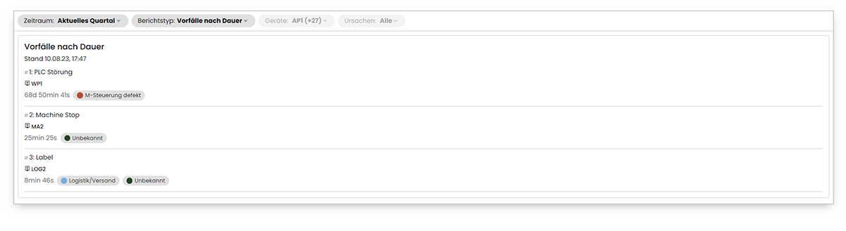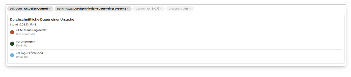 Absteigend nach der Dauer der Ursache werden hier die von Ihnen angelegten Ursachen aufgelistet, die einem Vorfall zugeordnet worden sind. Besonders in einem historischen Vergleich zeigt Ihnen dieser Bericht, ob verschiedene Ursachen schneller behoben werden konnten.