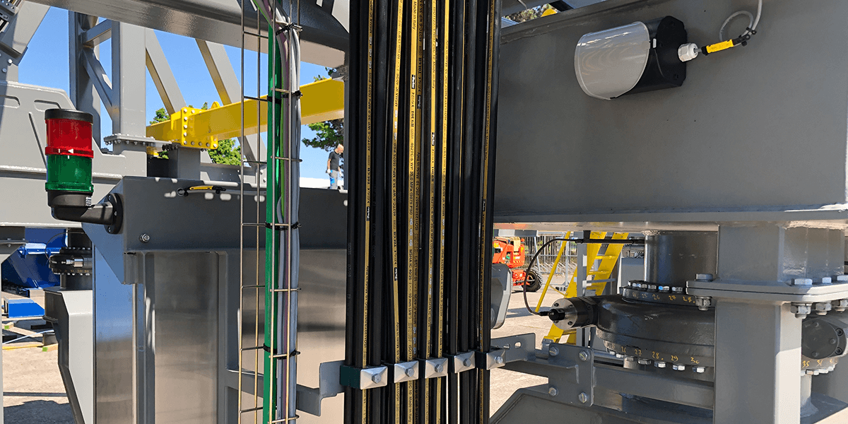 Das Besondere an diesen Wiegetrichtern ist ihre enorme Größe: Sie sind jeweils 13 Meter hoch und wiegen mehr als 90 Tonnen. Dielemann sagt: „In Anbetracht dieser kolossalen Größe ist es zwingend erforderlich, für alle Personen, die sich im Bereich dieser Geräte aufhalten, entsprechende Warnsignale anzubringen".