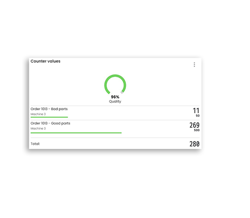 In WeASSIST, counter signals can be recorded directly on the dashboard. This allows you to monitor the number of pieces produced, the cycle time and the rate at which your parts are completed. You also have the option of comparing the ratio of good and bad parts to determine a meaningful quality score.