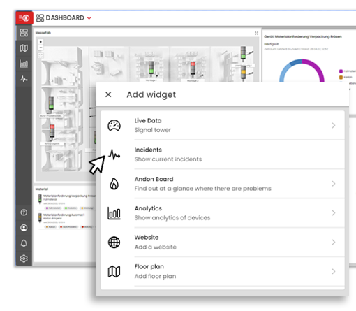 The acknowledgement function and the push-button switching directly from the dashboard are central elements for fast and efficient control in production. With the acknowledgement function, faults or messages can be confirmed directly on the dashboard to quickly resume the production process and document responsibilities.